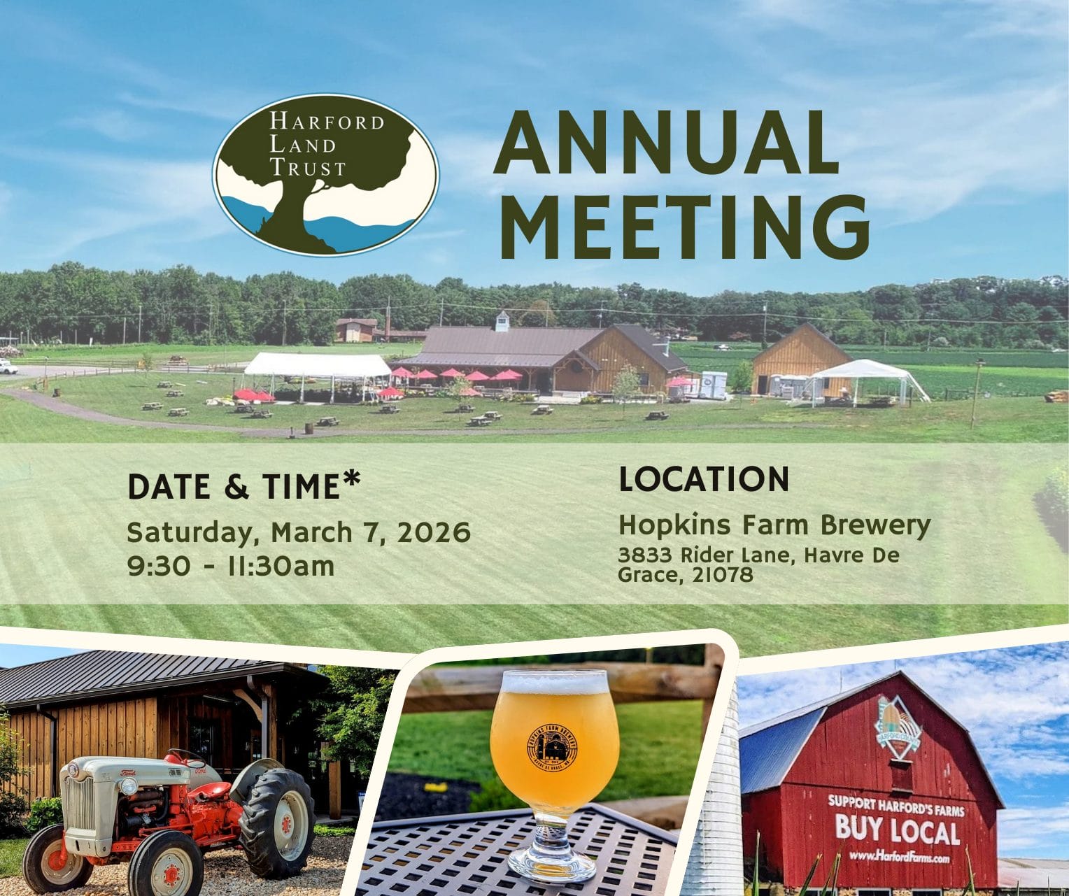 Please join us at Hopkins Farm Brewery on Saturday, March 7, at 9:30 am for Harford Land Trust’s (HLT) Annual Meeting. The meeting will be held in a heated pavilion. Attendees are welcome to stay after the meeting to enjoy beers at the brewery and a meal from the food trucks on site. If you have any questions, please contact Hunter Hine at hhine@harfordlandtrust.org.